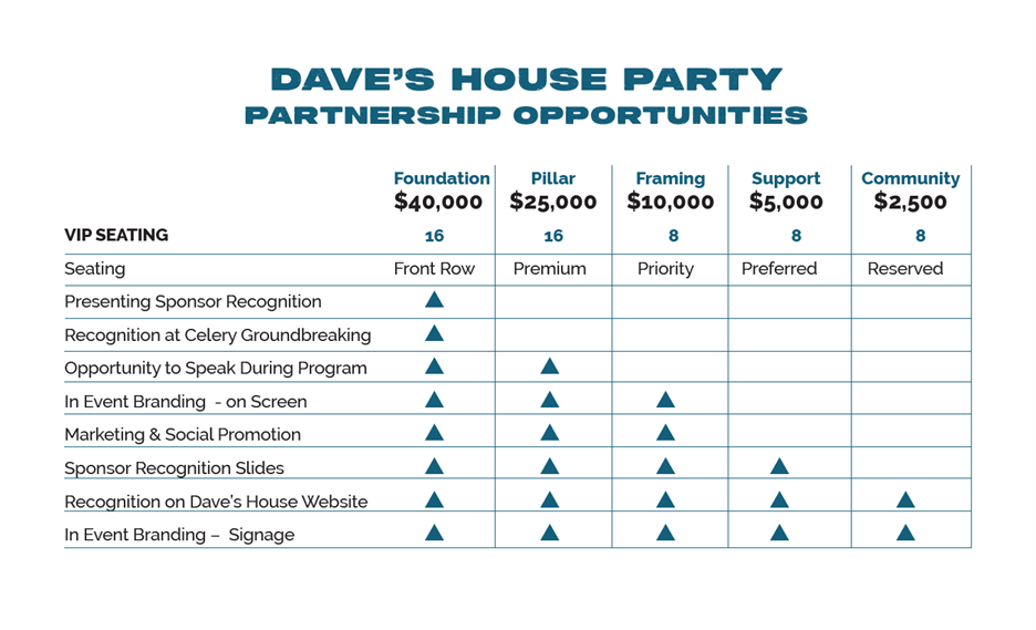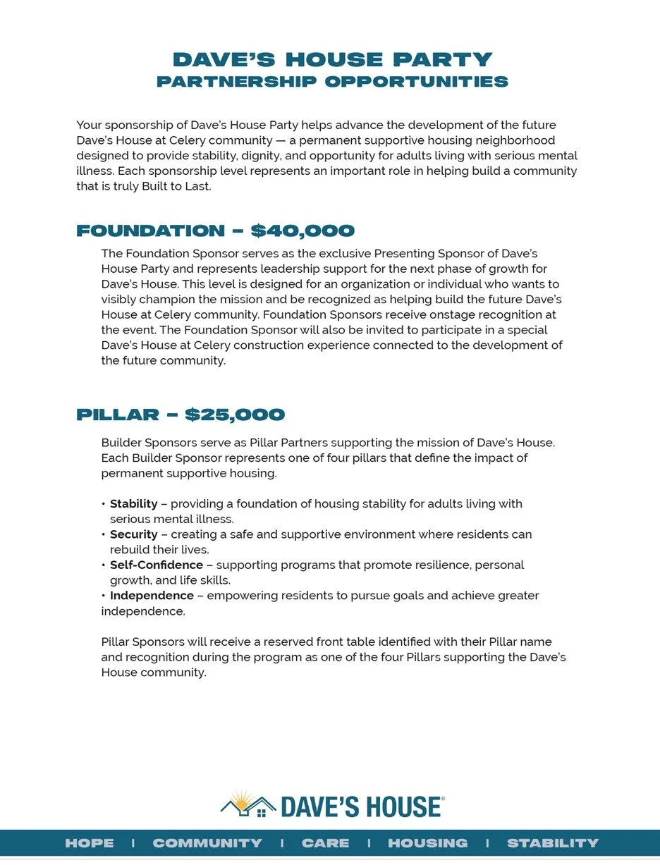 Sponsorships directly fuel the vision driving the development of Dave’s House at Celery Community, expanding access to permanent supportive housing and the services that make long-term stability possible. This is an opportunity to support something you can see, feel, and follow as it comes to life—a community being built to last.