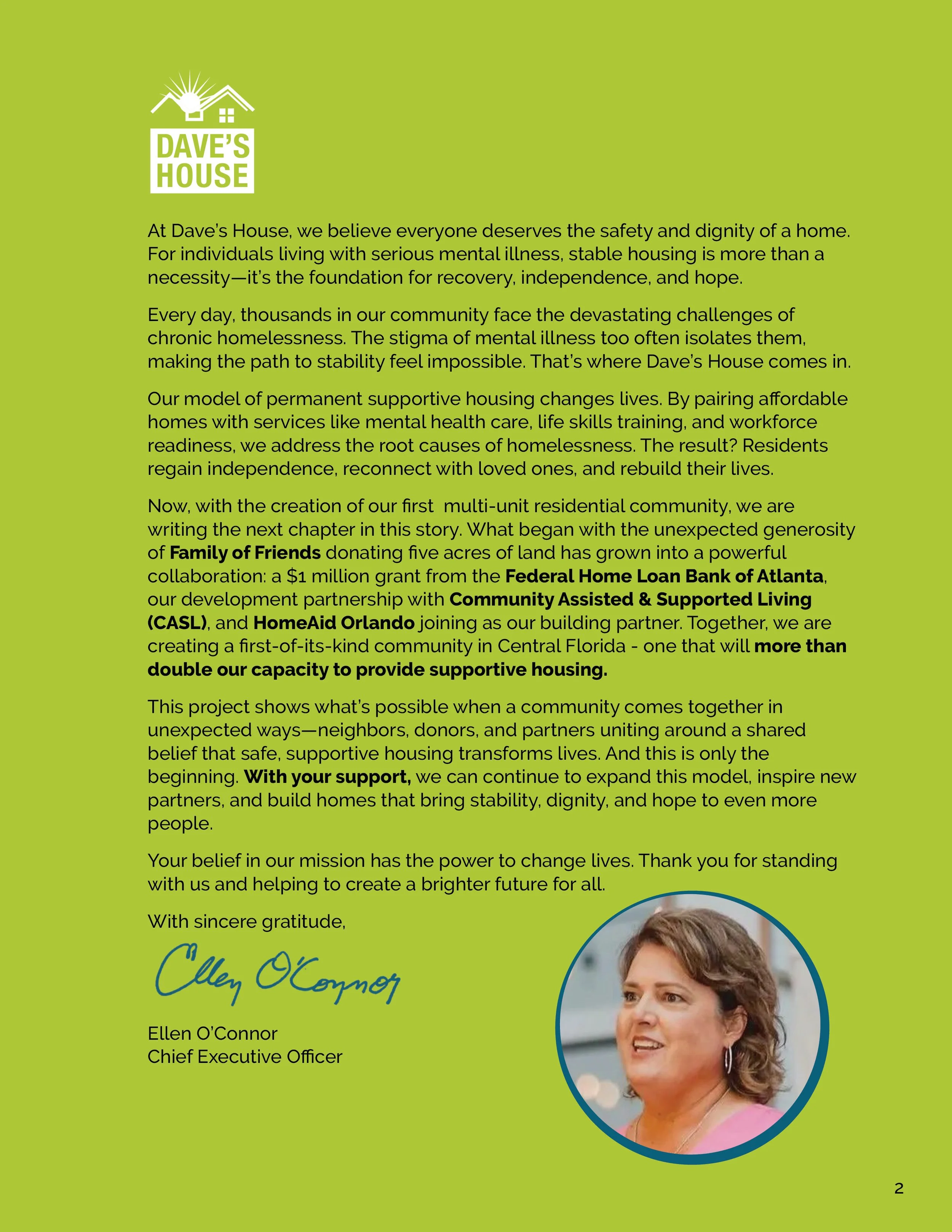 At Dave’s House, we know that ending the housing crisis for adults with serious mental illness begins with a safe, permanent home. For more than 16 years, we’ve been creating lasting recovery and transforming lives through housing stability, community connection, and supportive partnerships. Now, we are taking a bold next step. We are incredibly excited to introduce Dave’s House at Celery Community, our first multi-unit residential community in Central Florida. Located in Seminole County, this innovative neighborhood will provide a welcoming, supportive home for up to 31 adults living with serious mental illness and co-occurring disabilities. The community is designed to do more than house residents—it creates a foundation for dignity, purpose, and belonging. This project is made possible through powerful partnerships. Dave’s House has joined with Community Assisted & Supported Living (CASL) as co-developer and operational partner, and HomeAid Orlando as design and building partner. Together, we are combining statewide expertise, local leadership, and building industry talent to create a first-of-its-kind residential community in Seminole County.